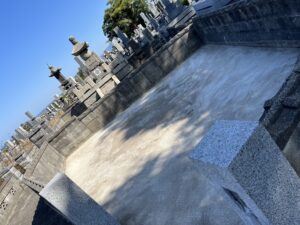 コンクリートをむき出しにしました。その方が草などが生えないと判断したからです。バラスだと花などの粒子などが飛んできて隙間から草や花が生えます。当社は撤去をした後の管理も踏まえて、きちんとご説明したうえでお墓撤去を行います。